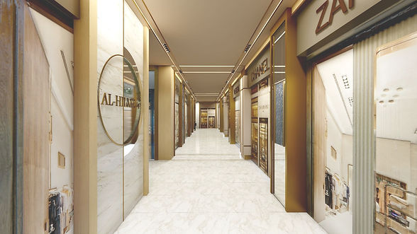The space features the central corridor flanked by high-end storefronts, rounded architectural edges, vertical green walls, and warm wooden details. The result is an elegant and functional interior that enhances the upscale retail experience.